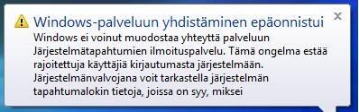 Kirjoita käynnistävalikon hakukenttään services.msc ja katso tila-sarakkeesta, onko Järjestelmätapahtumien ilmoituspalvelu päällä. Jos ei ole, kaksoisklikkaa sitä, laita se päälle ja varmista, että käynnistystapa on automaattinen.