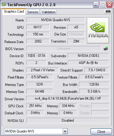 Mikä näytön ohjain malli minulla mahtaisi olla, kun sitä ei mikään tunnista kunnolla. Kaikki yrittämäni ohjelmat näyttävät Nvidia Quatro NVS, mutta ei malli numeroa. Tiedän että siinä on 64MB muistia ja H&L tuki, muttei mitään pixel tai vertex shaderia