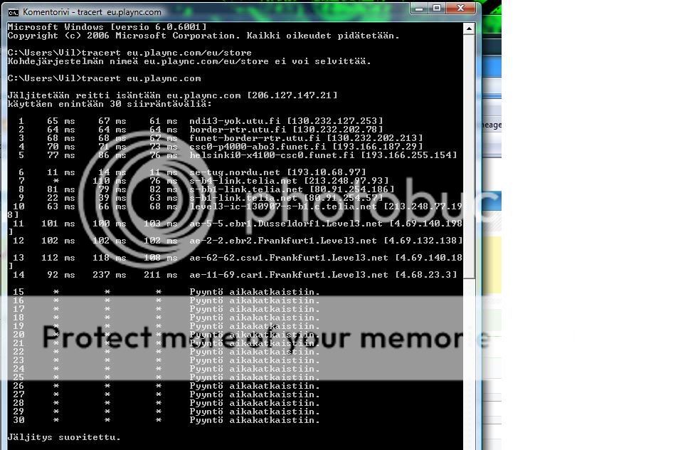 Jooh jossain vaiheessa netti kaatui täysin ja velipuoli sai sen osittain ylös mutta tänäänkin käyttökelpoisuus ollut pyöreet nolla. Tracertilla koitin katsoa josko oli kortista kiinni mutta en usko, samalla selkis että vika ei välttämättä olis paikallisverkostostakaan. Tällästä Tracert väitti: